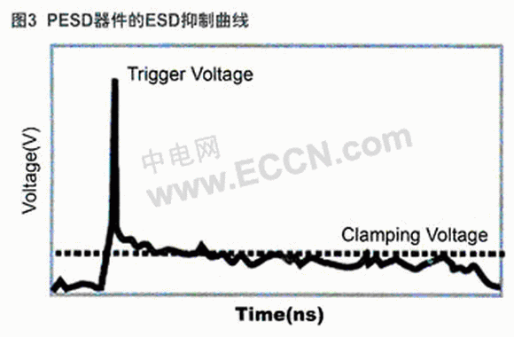 為滿足高速數(shù)據(jù)通訊接口既ESD保護(hù)有效、又不影響高速信號傳輸?shù)囊?。近年來,市場上推出了多種專門適用于此類保護(hù)要求的器件。其中以瑞侃電路保護(hù)部門(RCP:RaychemCircuit Protection)推出的PESD器件為代表。該器件的電容極低(通常0.25pF),漏電流極小(<0.001 A);ESD防護(hù)快速有效(響應(yīng)曲線如圖3所示,觸發(fā)電壓典型值為150~250V;響應(yīng)時間少于1 ns);價格低于低電容硅器件。因此,在高速數(shù)據(jù)傳輸條件下,PESD器件擁有更佳的保護(hù)應(yīng)用特性。該器件已成功應(yīng)用于HDMI1.3和USB2.0等多種高速接口電路。