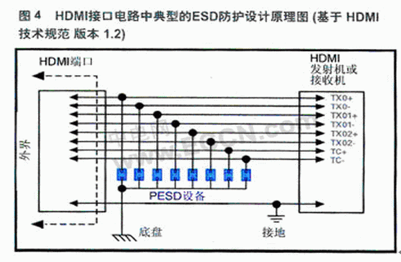 圖4、圖5和圖6展示了利用瑞侃電路保護(hù)部門PESD器件對HDMI1.3、USB2.0和IEEE1394接口電路進(jìn)行保護(hù)的典型應(yīng)用。這些保護(hù)將ESD與敏感電路隔離。在傳輸線路脈沖(TLP) 測試和IEC61000-4-2測試中,尤其是經(jīng)過多次采樣(1000次TLP測試)后,其性能要比其他可比較的元件好。相對于其他典型的聚合物ESD防護(hù)器件,這類PESD器件的較低觸發(fā)電壓(通常150V)和低箝位電壓(通常25V)能更好的幫助保護(hù)敏感電子元件。該器件采用電子工業(yè)中最流行的0603和0402貼裝形式,符合RoHS的嚴(yán)格要求;幫助機(jī)頂盒敏感電路、手提電腦、手機(jī)和其它便攜式設(shè)備免ESD侵害。