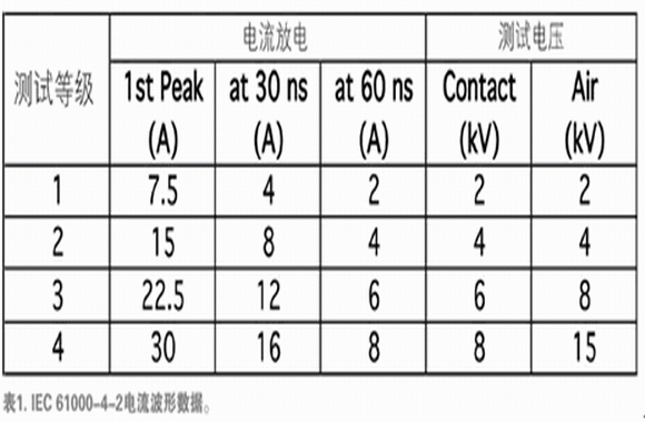 目前最常用的ESD抗擾度標(biāo)準(zhǔn)是IEC 61000-4-2標(biāo)準(zhǔn)。該系統(tǒng)級標(biāo)準(zhǔn)規(guī)定了一個(gè)源極模型,后者包含一個(gè)150pF電荷存儲(chǔ)器(在330 ohm源極電阻后面)和一個(gè)特定的電流放電波形(圖1和表1)。與舊標(biāo)準(zhǔn)規(guī)定的源極相比,大電荷存儲(chǔ)器和低源極電阻使源極模型能交付更多能量和更大電流。
