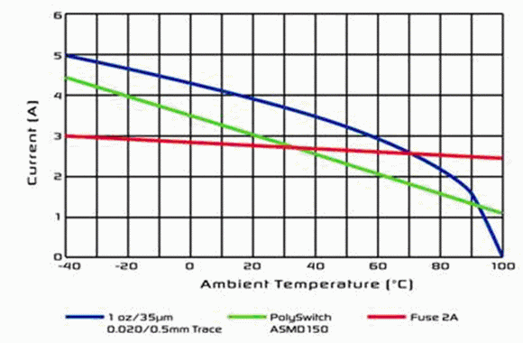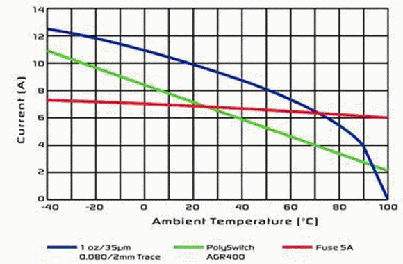 必須注意的是,在整個(gè)溫度范圍內(nèi),PPTC器件的觸發(fā)電流是如何跟隨印制線上的電流。在這兩種情況中,即使可以使用熔斷器,在汽車(chē)高于有用的標(biāo)準(zhǔn)溫度下,尺寸最接近的熔斷器也不能保護(hù)它。