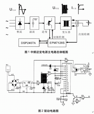 中頻逆變直流電阻焊機的供電電源是由三相工頻交流電源經整流電路和濾波電容轉換成直流電源,再經由功率開關器件組成的逆變電路轉換成中頻方波電源,然后輸入變壓器降壓后,經低管壓降的大功率二極管整流成直流電源,供給焊機的電極,對工件進行焊接(見圖1)??刂齐娐凡糠钟蒁SP和CPLD組成,DSP(TMS320LF2407A)產生的PWM波和檢測信號、保護信號在CPLD(EPM7128S)里現(xiàn)實邏輯運算。