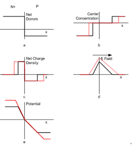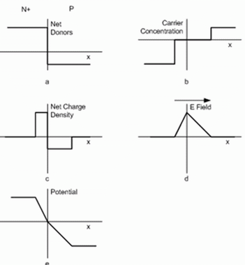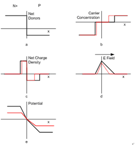 二極管的特性可以通過如圖1所示的突變型PN結(jié)來做深入理解。考慮到兩片硅材料,一片是重?fù)搅耸┲麟s質(zhì)的n+硅,一片是輕摻了受主雜質(zhì)的p硅。如圖1a所示那樣我們在x=0處將它們結(jié)合。n+區(qū)域電子密度等于施主雜質(zhì)的數(shù)目,而P區(qū)域認(rèn)為空穴密度等于受主雜質(zhì)濃度,但這種靜態(tài)情況將不會持續(xù)。在PN結(jié)邊界處電子將和空穴重新結(jié)合,結(jié)果是導(dǎo)致在PN結(jié)連接處的區(qū)域電子和空隙全被耗空。這就是圖1b所示的耗盡層,或者說是零載流子濃度區(qū)域。在這個連接處區(qū)域隨著載流子濃度的耗盡就成為靜電荷區(qū)域,如圖1c。在橫坐標(biāo)零點左邊,由于電子和右邊的空穴中和從而只剩下帶正電的靜電荷;在零點右邊,由于空穴和左邊的電子中和從而只剩下帶負(fù)電的靜電荷。在PN結(jié)連接處的兩邊耗盡區(qū)的寬度依賴于兩邊施主雜質(zhì)和受主雜質(zhì)各自的摻雜濃度。有個物理現(xiàn)象是PN結(jié)耗盡區(qū)總的正電荷數(shù)和負(fù)電荷數(shù)一樣,所以PN總體還是呈現(xiàn)不帶電狀態(tài)。 PN結(jié)連接處摻雜濃度高的一邊的耗盡層寬度比摻雜濃度低的一邊要窄得多。 耗盡區(qū)一定的靜電荷密度的存在產(chǎn)生了一個電場,其場強最大的地方是PN結(jié)連接處,如圖1d所示。PN結(jié)的電場存在產(chǎn)生了內(nèi)建電壓差,如圖1e所示。電場和電壓的存在會迫使電子向n區(qū)域移動,而空穴向p區(qū)移動。