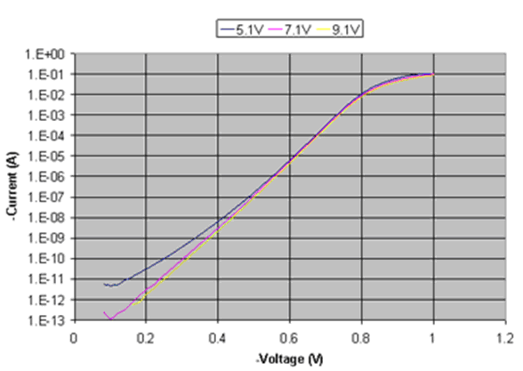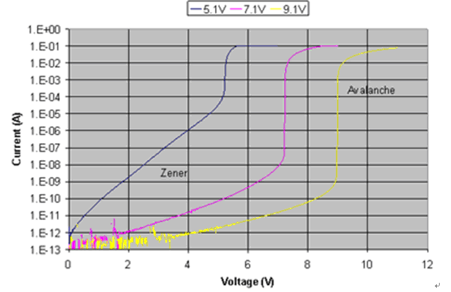 在高摻雜濃度下第二次擊穿發(fā)生。在高摻雜濃度下,電場變得太強以致電子從本質(zhì)上遠(yuǎn)離原子成為完全自由載流子。這個過程就是大家所知的齊納擊穿(在半導(dǎo)體中的一種非破壞性擊穿),這常常被描述為電子從禁帶到導(dǎo)帶的量子隧穿。齊納擊穿的電流相對電壓增長相對5.1V二極管的雪崩擊穿有一個更大的斜率,如圖6所表示。