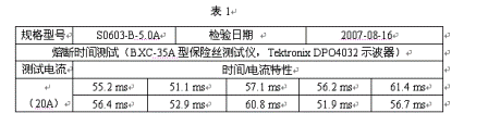 1.測試S0603-B-5.0A保險(xiǎn)絲在20A熔斷時(shí)間如下表1