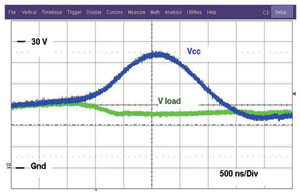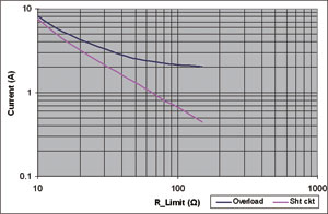 圖2展示NIS5132的一對曲線。導(dǎo)通較低的曲線時(shí),激活的是短路曲線。一旦電流降低至低于這個(gè)電平,F(xiàn)ET就完全導(dǎo)通(線性區(qū)域),接下來面對的就是過載電平。如果電流達(dá)到過載電平,F(xiàn)ET的柵驅(qū)動(dòng)將立即減小,而漏極至源極電壓將增加,并會(huì)將工作模式改為短路電平模式。這器件在過載電平時(shí)不能維持穩(wěn)態(tài)工作。