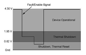 圖5顯示的是這電路的信號電平,而圖6顯示的是等效原理圖。在正常工作中,內(nèi)部電流源將啟用引腳上拉至4.3V。如果發(fā)生熱故障,由于過大直流電流、限流或過壓保護(hù)原因,這器件將關(guān)閉,熱邏輯將把這信號下拉至1.6V電平。