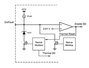 目前的器件有熱閂鎖電路,在發(fā)生熱故障時(shí)會(huì)關(guān)閉器件。然后芯片能通過下拉啟用引腳至地并釋放熱,或是重新啟動(dòng)輸入電源來重啟。