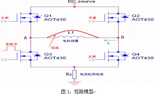 短路模型如圖1所示,其中僅畫(huà)出了功率輸出級(jí)的A、B兩相(共三相)。Q1和Q3為A相MOSFET,Q2和Q4為B相MOSFET,所有功率MOSFET均為AOT430。L1為電機(jī)線(xiàn)圈,Rs為電流檢測(cè)電阻。
