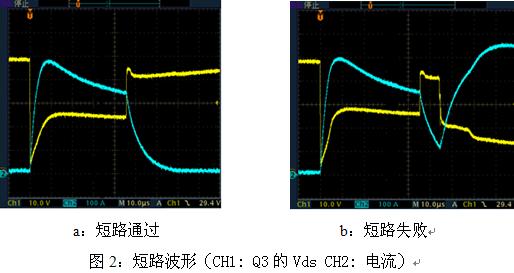 當(dāng)控制器工作時(shí),如電機(jī)短路,則會(huì)形成如圖1中所示的流經(jīng)Q2,Q3的短路電流,其電流值很大,達(dá)幾百安培,MOSFET的瞬態(tài)溫升很大,這種情況下應(yīng)及時(shí)保護(hù),否則會(huì)使MOSFET結(jié)點(diǎn)溫度過(guò)高而使MOSFET損壞。短路時(shí)Q3電壓和電流波形如圖2所示。圖2a中的MOSFET能承受45us的大電流短路,而圖2b中的MOSFET不能承受45us的大電流短路,當(dāng)脈沖45us關(guān)斷后,Vds回升,由于溫度過(guò)高,僅經(jīng)過(guò)10us的時(shí)間MOSFET便短路,Vds迅速下降,短路電流迅速上升。由圖2我們可以看出短路時(shí)峰值電流達(dá)500A,這是由于短路時(shí)MOSFET直接將電源正負(fù)極短路,回路阻抗是導(dǎo)線(xiàn),PCB走線(xiàn)及MOSFET的Rds(on)之和,其數(shù)值很小,一般為幾十毫歐至幾百毫歐。