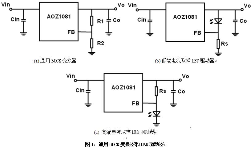 本文將基于A(yíng)OZ1081來(lái)介紹反饋環(huán)的設(shè)計(jì),因此先介紹一下AOZ1081的工作特點(diǎn)。AOZ1081是一款降壓型Buck變換器,工作于電流模式,其特點(diǎn)可以讓它配置成LED驅(qū)動(dòng)器,同時(shí)也可以作為通用Buck變換器使用。其特點(diǎn)如下: