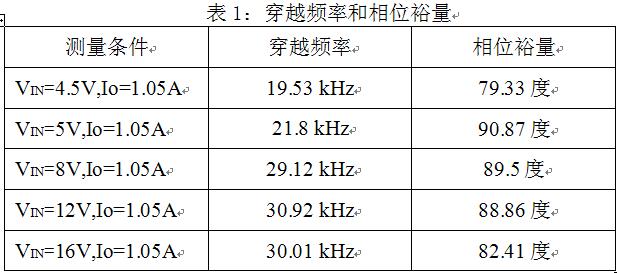 基于A(yíng)OZ1081設(shè)計(jì)LED驅(qū)動(dòng)器,輸入電壓4.5 V到16 V,輸出為一個(gè)HB LED,;使用Venable的3120測(cè)量環(huán)路,Rc=61.9kohm,Cc=820pF,測(cè)量波形和結(jié)果如圖4和表1所示。