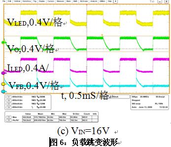 可以用圖5的負(fù)載跳變來(lái)驗(yàn)證系統(tǒng)的穩(wěn)定性,MOS驅(qū)動(dòng)信號(hào)的頻率為1kHz,負(fù)載電流從35mA到350mA跳變,波形如圖6所示