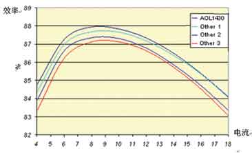 注意到圖2中,除了柵極結構,其他的部分就是標準的采用Trench工藝的MOSFET。柵極被分割成上下兩個部分,下部分用一些特殊的材料屏蔽起來,下部分在內部和上部分的柵極相連,而柵極的屏蔽層被連接到源極,從而減小漏極柵極米勒電容。用這種技術設計的MOSFET如AOL1464,其Vds為30V,Vgs在10V條件下Rds(on)為6.2mΩ,而其Crss只有20pF,極大地減小了開關過程中米勒平臺的持續(xù)的時間,降低了開關損耗。AOL1430,其Vds為30V,Vgs在10V條件下Rds(on)為2.5mΩ,而其Crss為50pF。圖3中,下管采用AOS的AOL1428,上管采用AOL1430和其他廠家目前Crss最低的器件的效率曲線,可見,上管采用AOL1430具有非常高的效率。注意:輸入電壓12V,輸出電壓 1.7V,開關頻率300kHz。