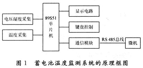 蓄電池溫度監(jiān)測系統(tǒng)的原理框圖如圖1所示。主要由電壓、溫濕度采集、溫度采集、89S51單片機(jī)、鍵盤控制模塊、顯示電路模塊、通信模塊組成。該系統(tǒng)能完成6組或6組以上通信電池的溫度測量、1路機(jī)房環(huán)境測量(溫度、濕度測量)、2路直流電壓和2路交流電壓測量,傳輸數(shù)據(jù)距離大于200m。
