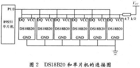 DS18B20和單片機(jī)的連接如圖2所示,由VCC直接供電,連接一個4.7kΩ左右的上拉電阻,DQ直接連到單片機(jī)的P1.0口上。