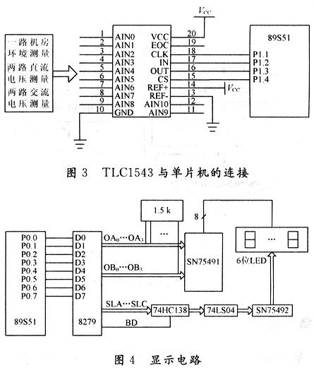 直流電壓、交流電壓以及機(jī)房溫濕度的測量選用TLC1543,TLC1543為10位11通道的A/D轉(zhuǎn)換器,與單片機(jī)的連接如圖3所示。機(jī)房環(huán)境測量(溫度、濕度)采用JWS溫濕度變送器,輸出信號為標(biāo)準(zhǔn)0~5V直流電壓信號;直流電壓的數(shù)據(jù)采集經(jīng)電阻分壓后直接送至A/D轉(zhuǎn)換器,交流電壓的采集經(jīng)分壓整流后也直接送至A/D轉(zhuǎn)換器。