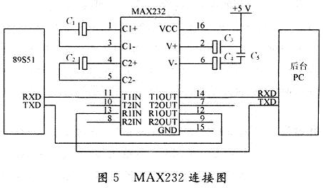 為了滿足數(shù)據(jù)傳輸距離大于200m,通信采用75LBC180全雙工485芯片,單片機(jī)通信電平和計算機(jī)電平的轉(zhuǎn)換采用MAX232完成,如圖5所示。MAX232芯片是專為電腦的RS232標(biāo)準(zhǔn)串口設(shè)計的接口電路,使用+5V單電源供電。另外。RS232到RS485的轉(zhuǎn)換可采用專用的轉(zhuǎn)換器,如BOK-60或ATC-160A無源轉(zhuǎn)換器。