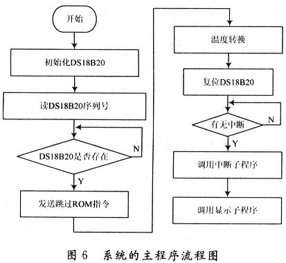 蓄電池溫度監(jiān)測系統(tǒng)的軟件設(shè)計主要包括主程序、外部中斷子程序、顯示子程序等。圖6是該系統(tǒng)的主程序流程圖。用于完成對DS18B20的調(diào)用、中斷管理、測量溫度值的計算及溫度值的顯示等功能。主機(jī)89S51首先復(fù)位脈沖使信號線上所有的DS18B20芯片都被復(fù)位,接著發(fā)送跳過ROM操作命令,激活在線的所有DS18B20,然后系統(tǒng)轉(zhuǎn)人中斷處理流程,完成溫度轉(zhuǎn)換,讀取等工作。外部中斷子程序完成對溫度測量數(shù)據(jù)的讀取,顯示子程序完成液晶顯示器的初始化及顯示溫度值。