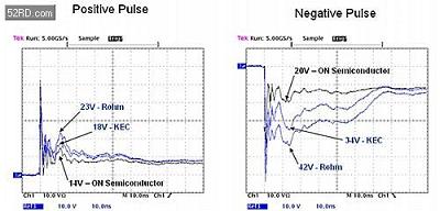從圖3所示的圖上可見,顯然,與兩個競爭對手的器件(藍(lán)色波形)相比較,安森美半導(dǎo)體保護解決方案(黑色波形)可提供更低的ESD脈沖箝位電壓。與KEC的18V和Rohm的23V相比較,安森美的器件將正脈沖箝位在14V。而在負(fù)脈沖期間,這三個器件之間箝位電壓的差異更加明顯。安森美、競爭對手2和競爭對手1的器件對負(fù)脈沖的箝位電壓分別是20V、34V和42V。