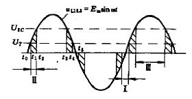 要指出的是所謂“過零”并非真的必須是電源電壓波形的零處,而一般是指在10~25V或-(10~25)V區(qū)域內(nèi)進(jìn)行觸發(fā),如圖2所示。圖中交流電壓分三個(gè)區(qū)域,Ⅰ區(qū)為-10V~+10V范圍,稱為死區(qū),在此區(qū)域中加入輸入信號時(shí)不能使SSR導(dǎo)通。Ⅱ區(qū)為10~25V和-(10~25)V范圍,稱為響應(yīng)區(qū),在此區(qū)域內(nèi)只要加入輸入信號,SSR立即導(dǎo)通。Ⅲ區(qū)為幅值大于25V的范圍,稱為抑制區(qū)在此區(qū)域內(nèi)加入輸入信號,SSR的導(dǎo)通被抑制。