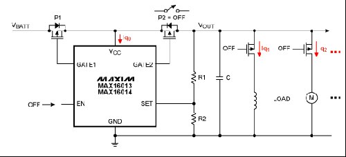 圖9.MAX16013/MAX16014用作主開關(guān)控制,在ECU關(guān)閉時(shí)有助于降低靜態(tài)電流損耗。