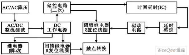 斷電延時繼電器整體構成包括斷電延時繼電器電源部分(經降壓、整流、濾波)以提供斷電延時繼電器內置瞬動電磁繼電器和2繞組閉鎖型R復位線圈工作);二次電源部分(供斷電后延時部分與2繞組閉鎖型S置位線圈工作);延時工作部分(可編程定時集成或CMOS計數分頻集成);驅動部分;執(zhí)行繼電器部分組成(圖1)。