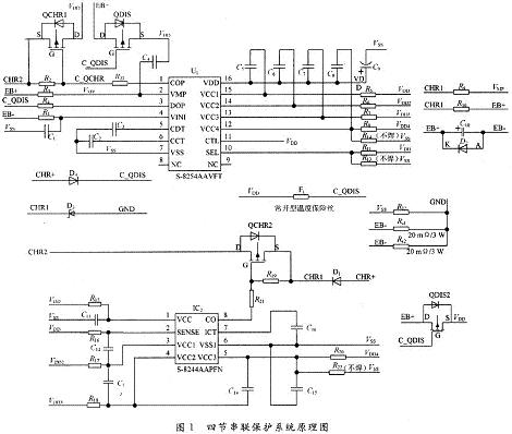 圖1為四節(jié)電池串聯(lián)使用時的保護(hù)系統(tǒng)原理圖。