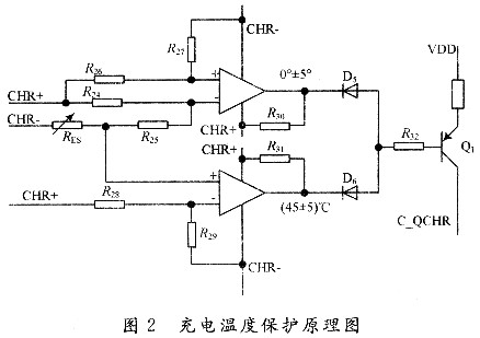 為了確保充電時的安全性和延長電池的使用壽命,電池的充電溫度應(yīng)控制在O~45℃之間為宜。該系統(tǒng)采用一個負(fù)溫度系數(shù)的NTC溫度傳感器RES和一個2路比較器LM393來實(shí)現(xiàn)充電溫度保護(hù),其原理圖如圖2所示:當(dāng)充電溫度位于O~45℃之間時,LM393的兩路比較器輸出均為高阻態(tài),PNP型三極管Q1關(guān)斷,對充電電路不產(chǎn)生影響;隨著溫度的升高,RES阻值逐漸變小,當(dāng)溫度大于45℃時,LM393下面一路比較器反轉(zhuǎn),輸出低電平,通過二極管D6將Q1的B極拉低,Q1導(dǎo)通,充電MOS管QCHRl的G極C_QCHR被強(qiáng)制拉高,QCHRl關(guān)閉,停止充電;同樣,隨著溫度的降低,RES阻值逐漸變大,當(dāng)溫度小于O℃時,LM393上面一路比較器輸出低電平,通過二極管D5將Q1導(dǎo)通,從而關(guān)閉QCHRl,停止充電。[page]