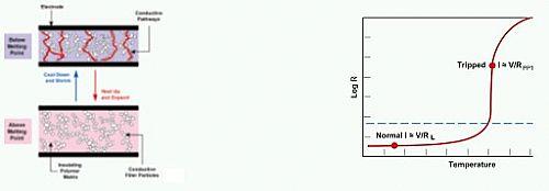 圖2.在過電流或過熱情況下,PPTC元件通過從低阻值狀態(tài)轉換為高阻值狀態(tài)來保護電路