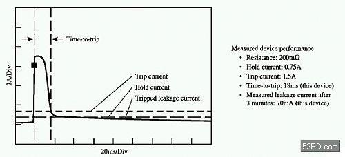 動作時間是PPTC在故障情況下對動作速度的特性所進行之描述。在小功率應用條件下,動作時間是關鍵因素,因為在整個系統(tǒng)的電壓降低或減弱且系統(tǒng)性能受到影響之前,小型電源維持在短路電流而不受損的時間可能很短。動作時間數(shù)值與元件的設計、元件的大小和工作電流性能有很大關系,且還要考慮到電路板設計;即電路板上較寬的連線或較大的焊接器等同于散熱器,均可增加動作時間??s小焊接器的尺寸,選擇較低的工作電流能夠改善動作時間性能。