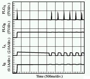 PowerSwitch電源開關元件檢測到了通道A的故障,并開始限制電流。而只有在通道A,PowerSwitch將真正地開始ON/OFF循環(huán)週期直至故障現(xiàn)象消失。而通道B上的連續(xù)電流處于技術規(guī)范之內(nèi),其工作保持不受影響。