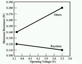 在USB的設計中,另一項重要的考慮因素是隨著電壓的下降,電阻值也會下降。隨著供電電壓的下降,電壓降問題顯得更加突出。一般來說,電壓下降將導致電源開關的導通電阻增加,這是一種不期望的特性。但Raychem的PowerSwitch元件的電阻卻能夠隨著供電電壓的下降而下降,因而避免這不利特性。如圖7所示,在匯流排電壓較高時,PowerSwitch能夠減少輸出電流值,提升電源的效率和電池的使用壽命。在匯流排電壓較低時,PowerSwitch兩端的電壓降也會降低,這樣USB功能就能繼續(xù)工作一段更長的時間。