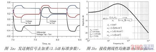 這些寄生電容存在于USB3.0收發(fā)器內(nèi)部和/或PCB外部。不匹配的PCB線路、USB3.0連接器或其它并聯(lián)電容器等,均會(huì)造成外部寄生電容。因此,這些額外的并聯(lián)電容器必須盡可能小。還必須考慮到USB3.0電纜的低通頻率響應(yīng)(圖2b)。為抵消高頻內(nèi)容的衰減,可在發(fā)送側(cè)和接收側(cè)利用專(zhuān)用均衡器改變信號(hào)。這些措施均有助于加快信號(hào)上升和下降邊的速度,從而得到張得更開(kāi)的眼圖(即更高的信號(hào)完整性)(見(jiàn)圖3a和圖3b)。