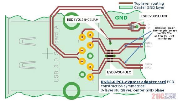 具備ESD防護(hù)電路的標(biāo)準(zhǔn)A連接器USB3.0布局布線設(shè)計(jì)建議圖5:具備ESD防護(hù)電路的標(biāo)準(zhǔn)A連接器USB3.0布局布線設(shè)計(jì)建議。USB3.0的新型ESD防護(hù)策略持續(xù)不斷地減小芯片的各個(gè)組件的尺寸是降低生產(chǎn)成本、提高工作頻率的根本,但與此同時(shí),這種微型化也產(chǎn)生了新的問(wèn)題(如容易發(fā)生ESD擊穿)。