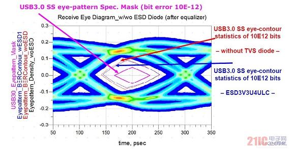 模擬所用誤碼率為1E6。根據(jù)模擬結(jié)果,推導(dǎo)出誤碼率為1E12時(shí)的眼圖張開(kāi)程度(紅色和藍(lán)色輪廓線)。分別在未帶TVS二極管(紅色輪廓線)和帶有TVS二極管(ESD3V3U4ULC,藍(lán)色輪廓線)的情況下,計(jì)算出眼圖的張開(kāi)程度(圖7)。在主機(jī)側(cè)和設(shè)備側(cè)帶和未帶ESD3V3U4ULC時(shí)的眼圖圖7:在主機(jī)側(cè)和設(shè)備側(cè)帶和未帶ESD3V3U4ULC時(shí)的眼圖。在主機(jī)側(cè)和設(shè)備側(cè)帶有超低電容TVS二極管ESD3V3U4ULC,眼圖張開(kāi)程度(輪廓線)會(huì)受到一定影響。雖然眼圖張開(kāi)程度會(huì)略微減小,但相比于USB3.0技術(shù)規(guī)范中規(guī)定的基準(zhǔn)模式(紅紫色輪廓線),仍大出許多。