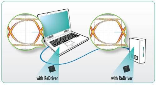 如果放在接收器之前,轉(zhuǎn)接驅(qū)動(dòng)器可以有效打開(kāi)信號(hào)眼圖的開(kāi)口,從而將信號(hào)質(zhì)量恢復(fù)到可以接收的范圍內(nèi)。轉(zhuǎn)接驅(qū)動(dòng)器可以調(diào)節(jié)信號(hào)、使用信號(hào)均衡的功能減少信號(hào)衰減和抖動(dòng),因此可以在更長(zhǎng)的距離和通過(guò)多個(gè)連接器的情況下提供干凈的信號(hào)傳送通道。信號(hào)可以恢復(fù)原有的強(qiáng)度再次傳送,就像是將信號(hào)通道拆成數(shù)個(gè)段落,并且在每個(gè)段落恢復(fù)信號(hào)的質(zhì)量。轉(zhuǎn)接驅(qū)動(dòng)器也允許產(chǎn)品設(shè)計(jì)師依照特定的應(yīng)用類(lèi)型調(diào)整最佳的信號(hào)均衡效果,因此可以確保設(shè)備可以通過(guò)最嚴(yán)格的USB3.0認(rèn)證要求。