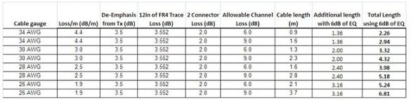 在一般的筆記本電腦至外圍設(shè)備的應(yīng)用中,信號(hào)會(huì)經(jīng)過(guò)長(zhǎng)于12英寸的PCB線路(10英寸線路在筆記本電腦中,2英寸在接口設(shè)備中),這將導(dǎo)致3.552dB的線路損耗(12英寸x0.296dB/英寸,使用9/10/9FR4走線,2.5GHz信號(hào)速度,不包括任何PCB導(dǎo)通孔)。加上每一個(gè)連接器產(chǎn)生的-1dB損耗,通過(guò)兩個(gè)連接器產(chǎn)生的損耗一共是2dB,因此留給線纜的信號(hào)損耗預(yù)算只剩下5.948~8.948dB。有遮蔽差分信號(hào)對(duì)線纜、2.50GHz速度的信號(hào)衰減大約是在34AWG的4.4dB/m到26AWG的1.9dB/m范圍內(nèi)。表1列出了根據(jù)這些數(shù)字計(jì)算出的能符合USB3.0規(guī)范的SDP線纜的最大長(zhǎng)度。表1中第三列到最后一列顯示,如果不使用信號(hào)調(diào)節(jié)產(chǎn)品,即便高質(zhì)量的28AWG線纜,也無(wú)法達(dá)到USB3.0規(guī)范要求的3米長(zhǎng)度。