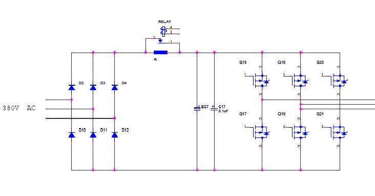 大家可以看出圖上標(biāo)出15KW的地方,就是我們的繼電器應(yīng)用的地方,一般在15KW以下的變頻器上的保護(hù)工作都是由繼電器來完成的,大于15KW的變頻器都是用接觸器來保護(hù)的,繼電器主要完成的作用為,大家知道當(dāng)電機(jī)啟動會有一個很大的沖擊電流,為了對變頻器進(jìn)行保護(hù),先用繼電器把這個大的沖擊電流擋住,也就是繼電器處于常開狀態(tài),等電流恢復(fù)到正常,繼電器關(guān)閉,把那個電阻短路,所以此處的繼電器一般都是需要電流比較大的,例如omron的G8P型繼電器,由于此處繼電器對電機(jī)有比較重要的作用,所以一般客戶都會選擇質(zhì)量較好的繼電器,有用OEG的,有泰科的,也有松川的。如果在15KW以上的變頻器,一般客戶不會選擇用繼電器來保護(hù),由于沖擊電流太大,一般客戶會選擇接觸器來保護(hù),但是接觸器的價格要比繼電器貴的多。還有一個地方,就是變頻器上都會有給客戶留的無源觸點,這個地方會用繼電器當(dāng)開關(guān)使用。