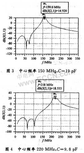 通常,電調(diào)諧濾波采用雙極點(diǎn)調(diào)諧濾波,諧振回路分為串聯(lián)諧振回路和并聯(lián)諧振回路,通過電感或電容進(jìn)行耦合。此電調(diào)濾波器采用的是并聯(lián)諧振回路,用電感進(jìn)行耦合。在進(jìn)行仿真之前,需要建立仿真模型和設(shè)計(jì)各種參數(shù)?;谝陨夏P?,利用ADS軟件對(duì)電調(diào)濾波器進(jìn)行電路設(shè)計(jì)和仿真。由于系統(tǒng)要求對(duì)該電調(diào)濾波器進(jìn)行AGC控制,所以在仿真時(shí)加入雙柵FET。傳輸函數(shù)S21、頻率范圍設(shè)在10~350 MHz、電容在2.6~39 pF之間變化,仿真使用的放大器是NE25118。最終的ADS模型仿真結(jié)果如下面兩組曲線所示。若LC濾波器不使用放大器,仿真結(jié)果中可以看出濾波器的插損在2~3 dB左右。