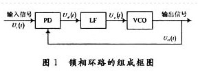 鎖相環(huán)路由3部分組成:鑒相器PD(Phase Detector)、環(huán)路濾波器LF(Loop Fillter)和壓控振蕩器VCO(Voltage-Control Oscillator)。組成框圖如圖1所示:
