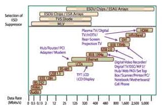 對(duì)于數(shù)據(jù)速率在350Mb/s或低于350Mb/s的應(yīng)用,瞬態(tài)抑制二極管和多層壓敏電阻是提供保護(hù)的極好選擇。這些應(yīng)用包括標(biāo)清LCD顯示器、TFT顯示器,以及大多數(shù)的計(jì)算機(jī)周邊接口及連接。這些信號(hào)天生就允許高的插入損耗、高鉗位電壓和觸發(fā)電壓。鑒于電源引腳上并沒(méi)有任何信號(hào),因此,高速抑制相應(yīng)并不是必需的。瞬態(tài)抑制二極管和多層壓敏電阻也可以有效地保護(hù)像USB 2.0以及其他更高速率的接口電源引腳。但是,對(duì)于像DVI、HDMI、USB 3.0以及最新的IEEE 1394 A和B標(biāo)準(zhǔn)下的數(shù)據(jù)通信線路,實(shí)現(xiàn)最小信號(hào)失真的高速抑制響應(yīng)對(duì)于系統(tǒng)性能和電路保護(hù)是至關(guān)重要的。這些應(yīng)用包括數(shù)字視頻設(shè)備、MP3播放器、手機(jī)、 PDA、網(wǎng)絡(luò)交換器、有線和衛(wèi)星電視機(jī)頂盒、打印機(jī)、掃描儀、復(fù)印機(jī)以及筆記本電腦和上網(wǎng)本等計(jì)算機(jī)設(shè)備。