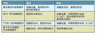 表 1給出了在靜電放電抑制器件中常用的幾種核心技術(shù)的優(yōu)點(diǎn)和缺點(diǎn)對(duì)比。聚合物靜電放電抑制器件在各種技術(shù)中可提供最低的漏電流,可承受非常高的靜電放電電壓脈沖,但在多次靜電放電事件后器件會(huì)開(kāi)始降級(jí)。除此之外,該類器件相對(duì)高的觸發(fā)電壓和鉗位電壓(比空氣間隙放電產(chǎn)品高出50~100倍)則意味著更多的靜電放電脈沖能量可以通過(guò)被保護(hù)的電路。
