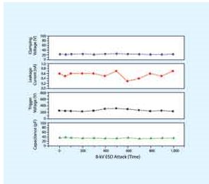 多年以來(lái),在多種電器設(shè)備中廣泛應(yīng)用多層壓敏電阻來(lái)提供有效的靜電放電抑制。多層壓敏電阻相對(duì)較低的擊穿電壓和觸發(fā)電壓以及能經(jīng)受多次脈沖的能力是相當(dāng)令人滿意的??墒?,多層壓敏電阻具有較高的漏電流和電容,并且降低電容帶來(lái)的有害影響導(dǎo)致其無(wú)法勝任高速數(shù)據(jù)的應(yīng)用。[page]
