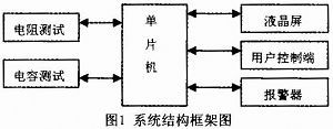 本文設(shè)計(jì)的電阻電容測(cè)試儀的系統(tǒng)結(jié)構(gòu)框架如圖1所示,系統(tǒng)主要由用戶控制端、單片機(jī)、液晶屏、電阻測(cè)試模塊、電容測(cè)試模塊、報(bào)警器以及其它附加功能模塊等組成。當(dāng)用戶需要測(cè)量某一電阻或電容的值時(shí),只需要把此電阻或電容放在相應(yīng)的測(cè)試位置,選擇好量程,測(cè)試儀即可自動(dòng)測(cè)出其電阻值或電容值,并把測(cè)試結(jié)果顯示在液晶屏上,方便用戶讀取。另外,此測(cè)試儀還具有超出量程警示功能和記憶功能,可存儲(chǔ)最近十次的測(cè)量結(jié)果。