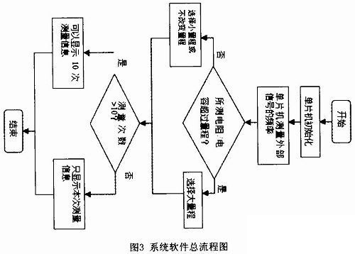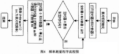 主要的子程序包括頻率測(cè)量子程序、鍵盤掃描子程序和數(shù)據(jù)存取子程序。頻率測(cè)量程序是系統(tǒng)軟件的核心,原理是用一個(gè)標(biāo)準(zhǔn)的頻率時(shí)鐘去計(jì)算被測(cè)的頻率,頻率測(cè)量程序流程圖如圖4所示。