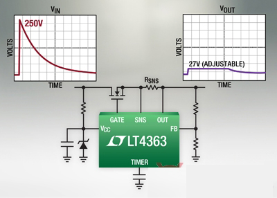 近日,凌力爾特公司推出過(guò)壓保護(hù)控制器 LT4363,該器件為高可用性電子系統(tǒng)提供了過(guò)壓和過(guò)流保護(hù)。當(dāng)流過(guò)長(zhǎng)電感性電源總線的電流突然變化時(shí),就會(huì)發(fā)生電源電壓浪涌。另外,汽車電池還會(huì)經(jīng)歷一種稱為負(fù)載突降的情況,在這種情況下,電壓會(huì)在持續(xù)多個(gè) ms 的時(shí)間里處于上升狀態(tài)。傳統(tǒng)的保護(hù)電路依靠笨重的電感器、電容器、保險(xiǎn)絲和瞬態(tài)電壓抑制器。而 LT4363 通過(guò)簡(jiǎn)單地控制一個(gè) N 溝道 MOSFET,實(shí)現(xiàn)了可靠、自適應(yīng)和節(jié)省空間的設(shè)計(jì)。只有控制器和 MOSFET 經(jīng)受高壓浪涌,下游組件可以提供較低電壓的額定值,因此節(jié)省了成本。