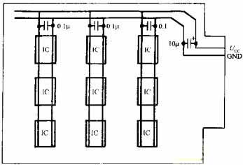 在單片機測控系統(tǒng)中使用了大量的數(shù)字IC,而每片數(shù)字IC本身都是一個脈沖干擾源,它們也會通過電源線相互干擾。解決辦法是在印制板電源進線端并聯(lián)一只10UF~100UF鉭電容進行電源退耦,同時在每個芯片的電源進線端再并聯(lián)一只高頻、低分布的電感的陶瓷電容,容量一般取0.1UF,當頻率超過15MHZ時,可取0.01JF,電路如圖所示。退耦電容的引腳要盡量短。