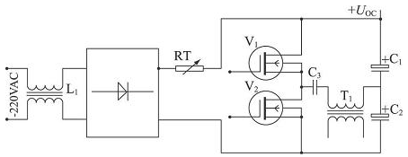 本系統(tǒng)開關電源采用負溫度系數(shù)電阻組成的軟啟動保護電路, 簡單實用, 工作可靠。如圖1, 220 V 交流電經線圈L1濾波共模干擾后, 整流產生約三百伏左右直流電壓, RT 電阻為負溫度系數(shù)熱敏電阻,型號為M02-7Ω。當電源合閘瞬間, 浪涌電流使得熱敏電阻發(fā)熱, 阻值迅速減小, 輸出直流電壓逐漸建立,可有效防止浪涌電流對電源電路的沖擊, 使得整個電源半橋變換電路穩(wěn)定可靠。