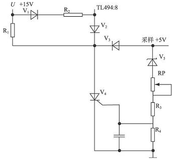 工作原理: 數(shù)控開關電源由輔助電源+ 15 V 提供給可控硅V4管陽極工作電壓, 實際輸出取樣電壓送至穩(wěn)壓管V5 , 當超出保護電壓閾值+ 5. 5 V 時, 輸出電壓經穩(wěn)壓管、電阻R3 、R4 分壓觸發(fā)可控硅V4 導通, 將輔助電源+ 15 V 通過電阻R1接地, 同時通過二極管V2切斷8 腳電源。調節(jié)RP 電位器, 可以對輸出電壓保護閾值點進行設置。