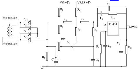 本開關電源過流保護電路的工作原理見圖4。變壓器T 1原邊串接在開關電源主變壓器原邊回路中, 通過實驗選擇合理的變壓器原副邊匝數(shù)比,感應開關電源變換時的原邊電流值, 經二極管V1 ~ V4 整流, R1、C1 濾波后送電位器RP。原邊電流越大,電流取樣變壓器整流出的電壓越大, 電位器RP 中心點電壓越低,TL494: 2 腳電壓隨之下降, 使得TL494: 3 腳電壓升高,送入脈寬調制器, 將T L494 驅動脈沖寬度逐漸減少, 從而得到過流保護的目的。圖中電容C4、C5、R10為TL494 誤差放大器的反饋元件, 使得放大電路穩(wěn)定可靠。